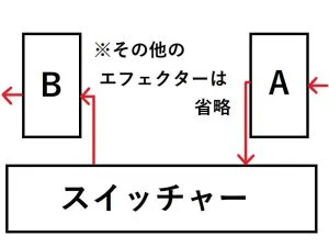 常時ONのエフェクターはスイッチャーの中に組み込む必要がないので、AまたはBの位置に置くことができます。