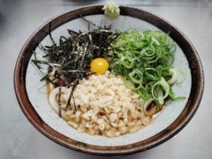 温かいぶっかけうどんはしょうがを乗せるのに対し、冷たい場合にはしょうがではなくわさびである点に注意してください。