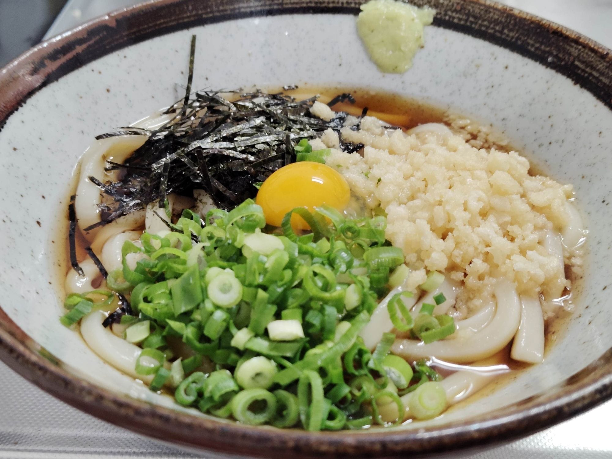 温かいぶっかけうどんはしょうがを乗せるのに対し、冷たい場合にはしょうがではなくわさびである点に注意してください。