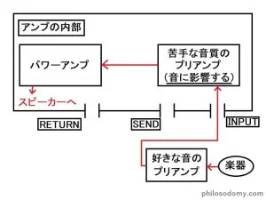 (※SWRやMarkBass等、回路構成の違いにより、リターン挿ししてもアンプ内のプリアンプ部を通ってしまうものもあります。)