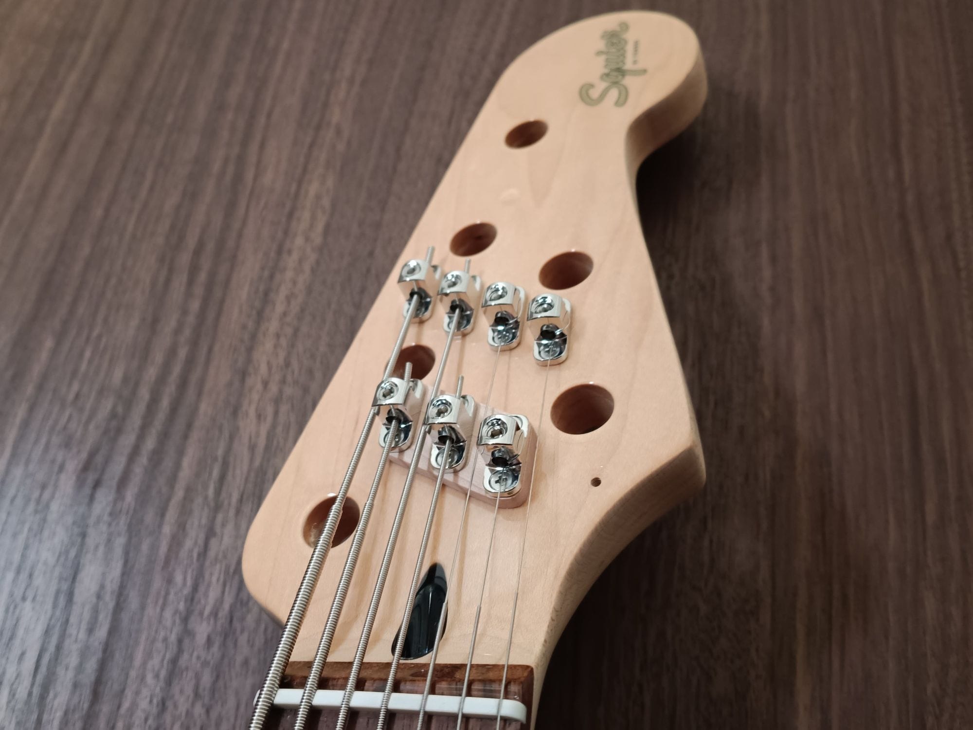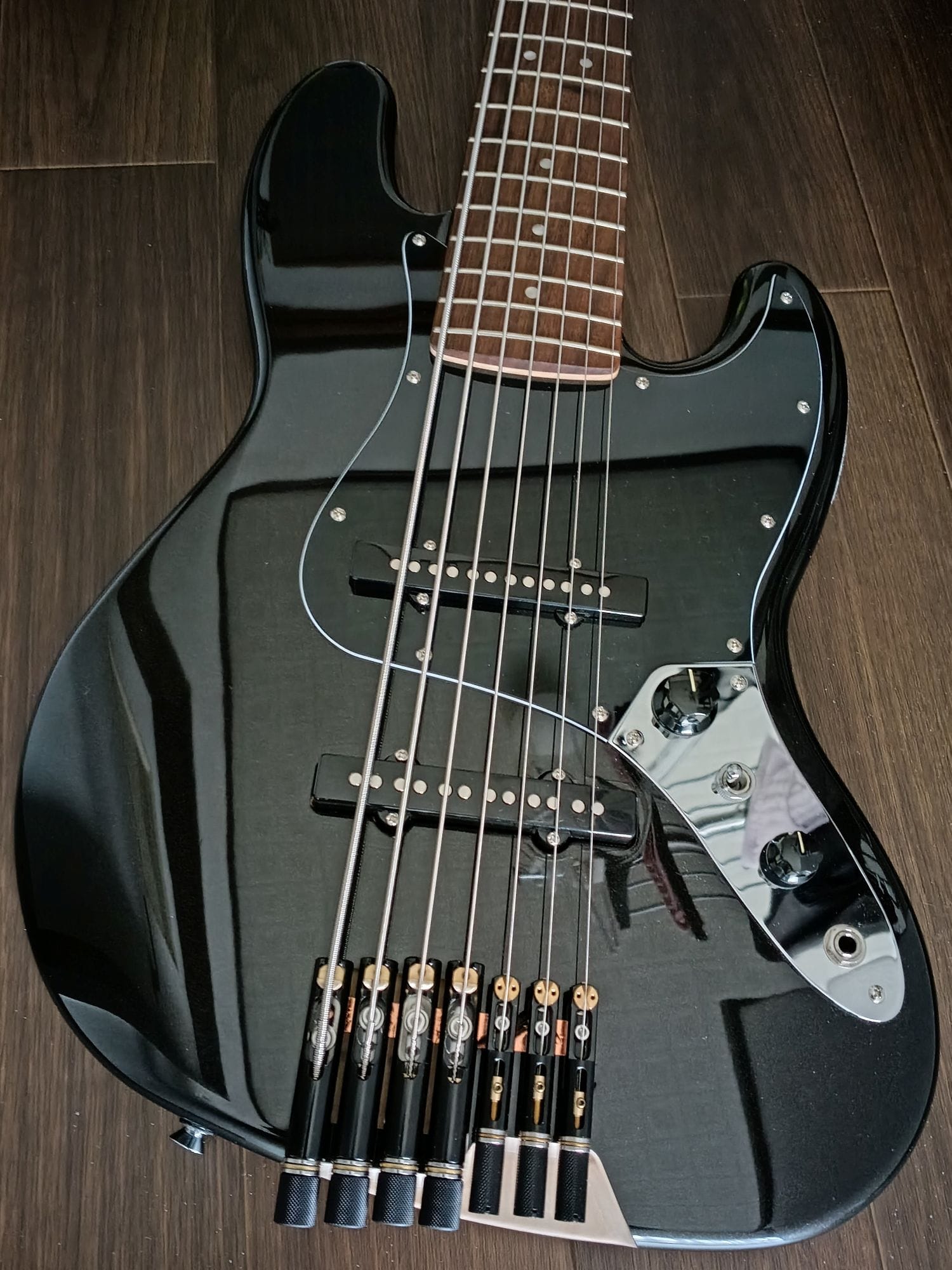 Squierの6弦ジャズベースを7弦化し、ヘッドレスユニットを用いてヘッド側でのチューニング機能を廃しました。